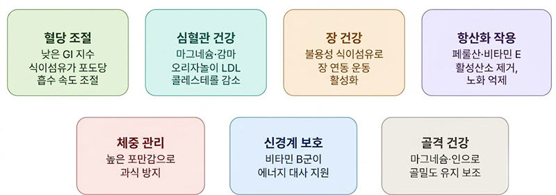 - 장 건강·소화 : 불용성 식이섬유가 장 연동 운동을 자극해 변비를 예방하고, 장내 유익균 증식에도 기여합니다.