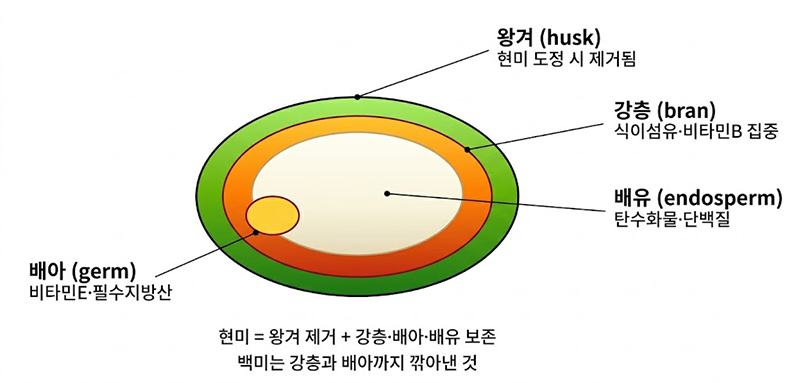 벼(Oryza sativa)를 수확해 가장 바깥의 딱딱한 왕겨(husk)만 제거한 것이 현미(玄米, brown rice)입니다. '현(玄)'은 검다는 뜻으로, 도정하지 않은 쌀의 갈색빛 껍질에서 유래했습니다. 백미는 이 현미를 다시 기계로 문질러 강층(bran)과 배아(germ)까지 깎아낸 것입니다. 한 번의 도정 과정에서 영양소의 상당 부분이 사라지는 셈이지요.